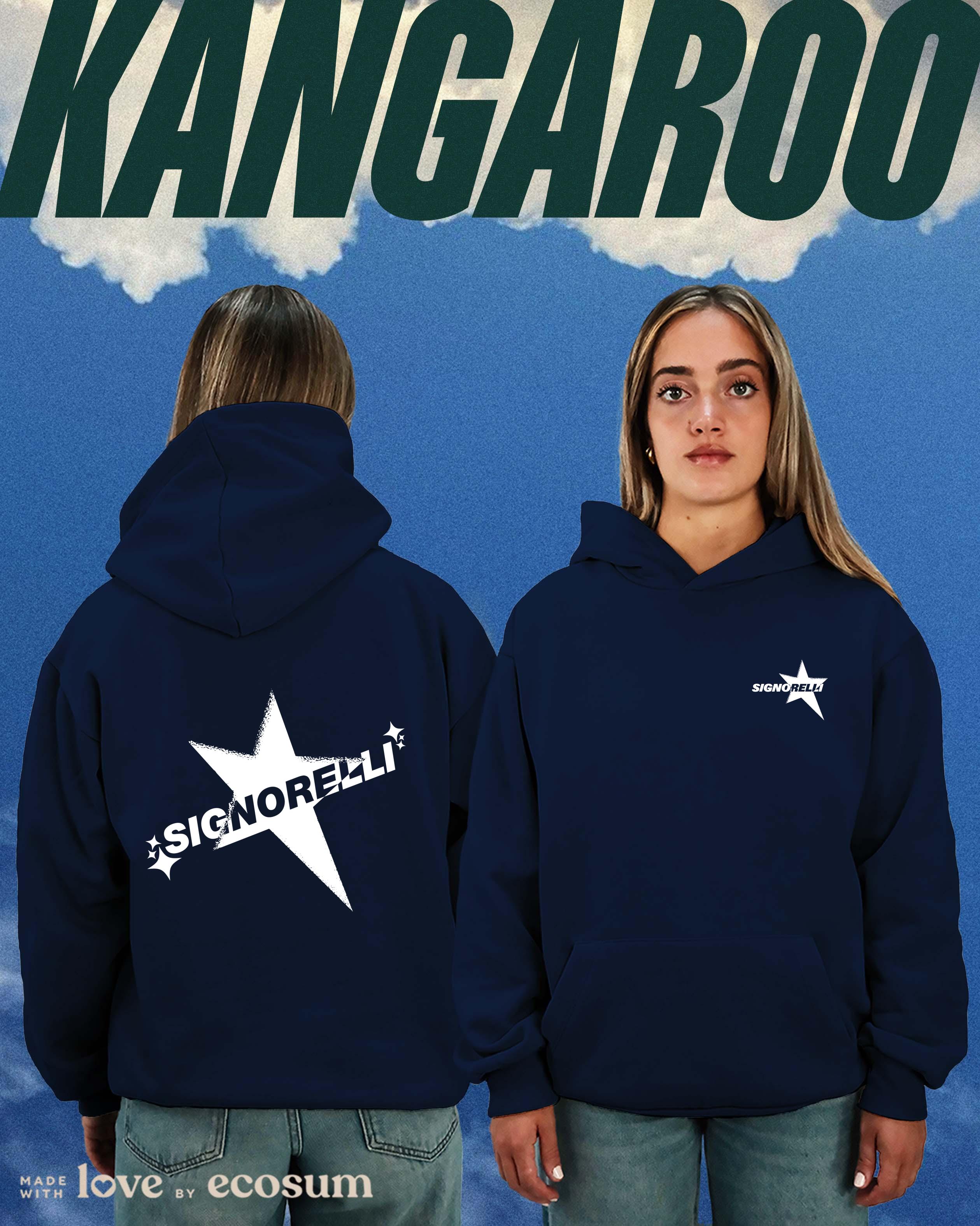 Hoodie iconica con cappuccio e tascone, studiata e prodotta in Italia con filati riciclati.