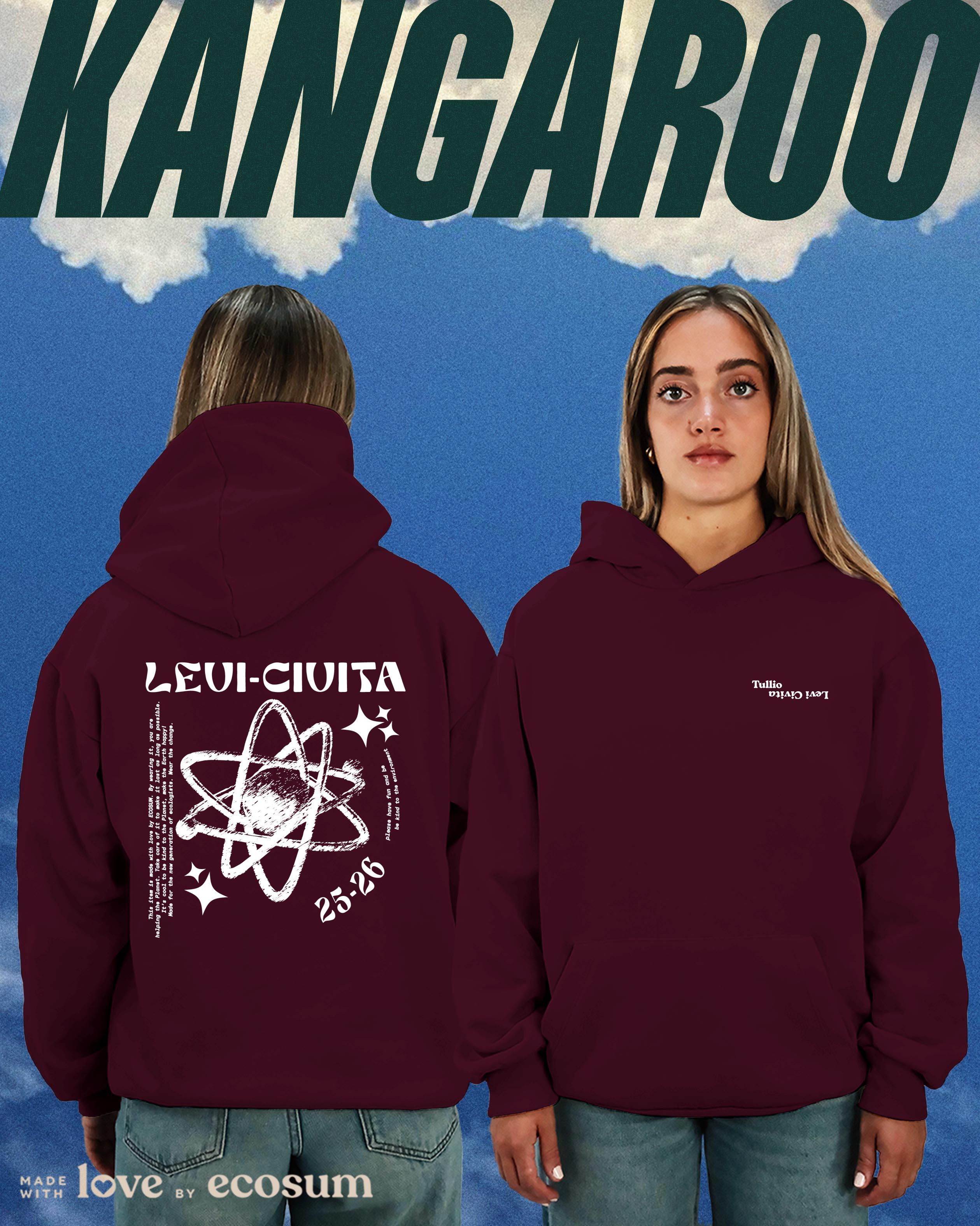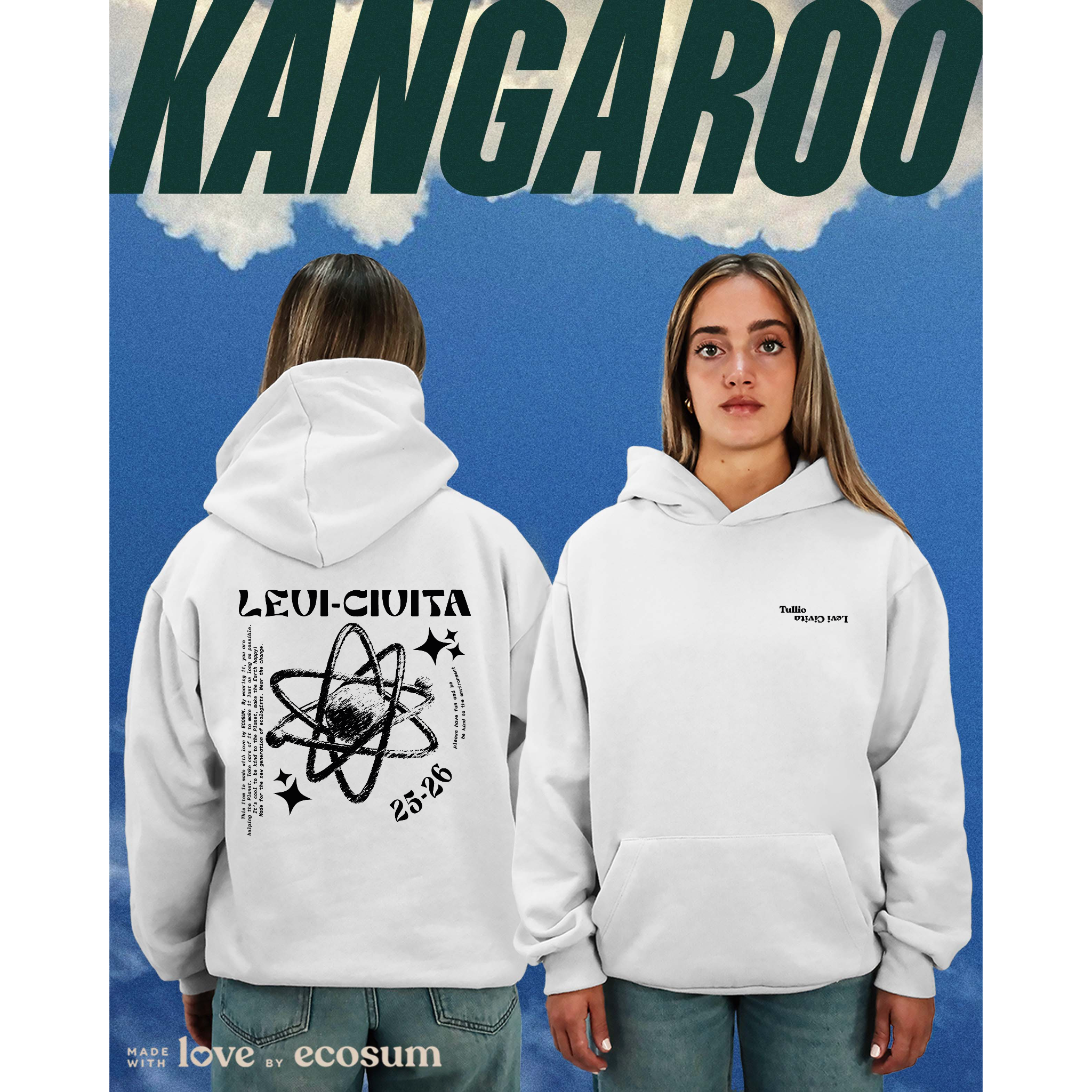 Hoodie iconica con cappuccio e tascone, studiata e prodotta in Italia con filati riciclati.