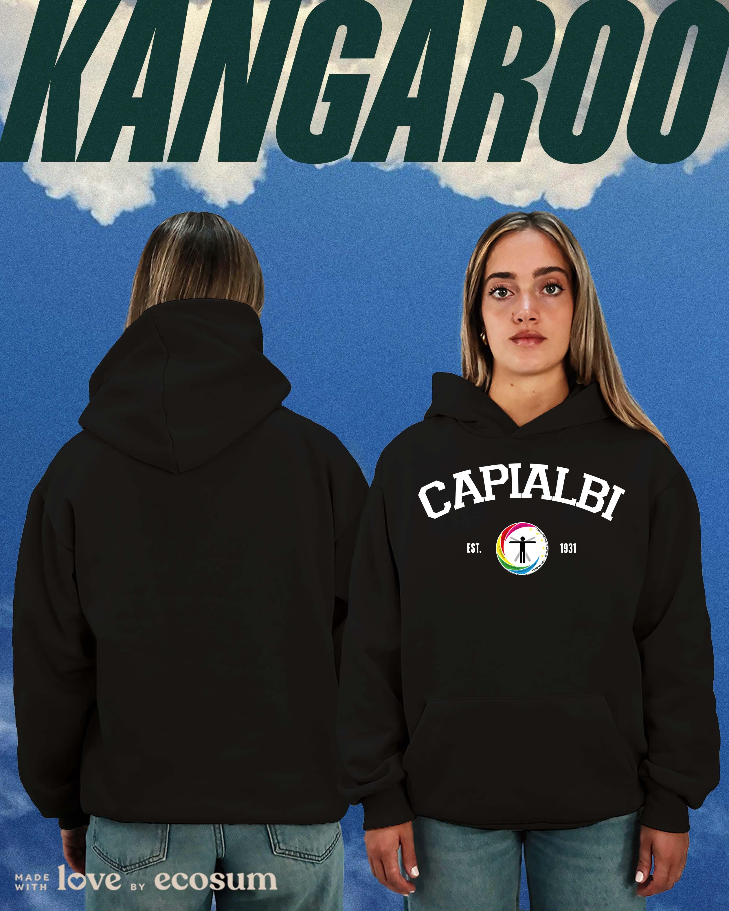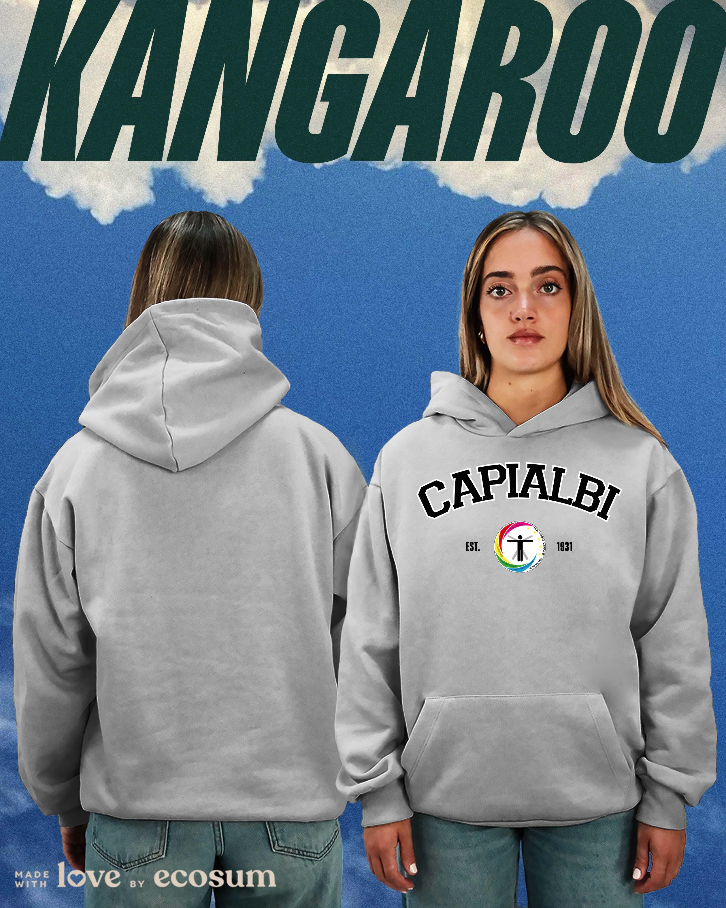 Hoodie iconica con cappuccio e tascone, studiata e prodotta in Italia con filati riciclati.