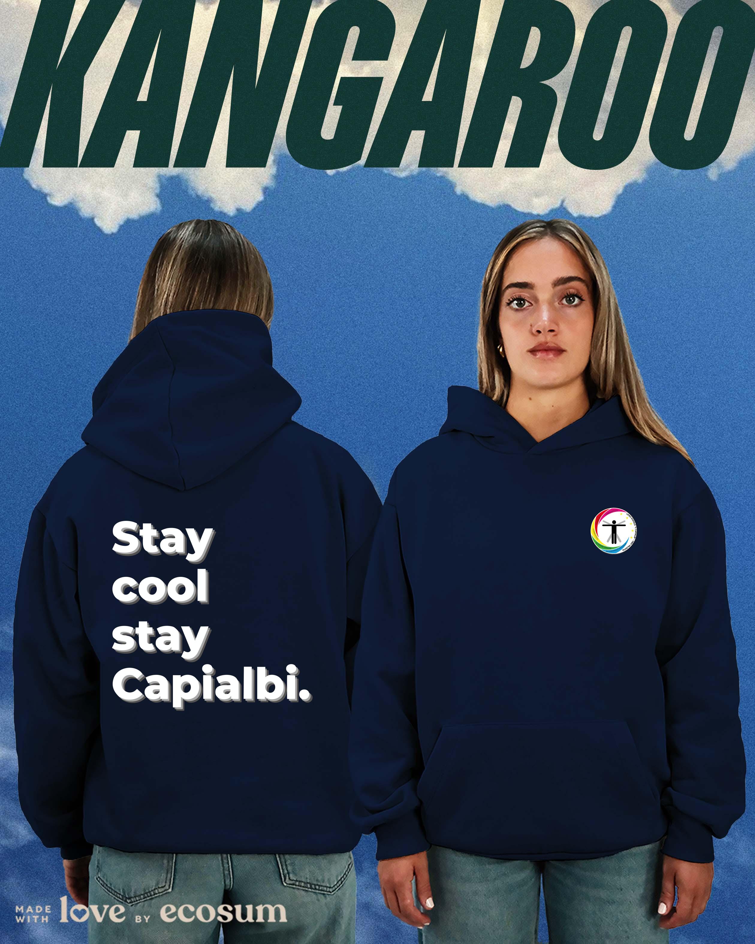 Hoodie iconica con cappuccio e tascone, studiata e prodotta in Italia con filati riciclati.