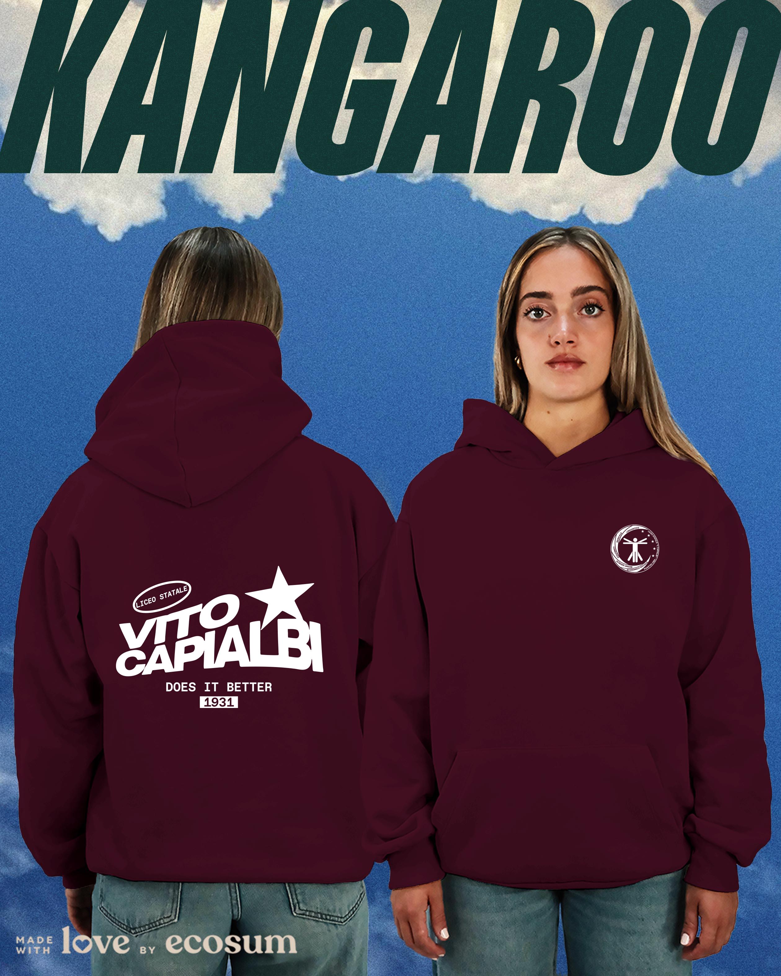 Hoodie iconica con cappuccio e tascone, studiata e prodotta in Italia con filati riciclati.