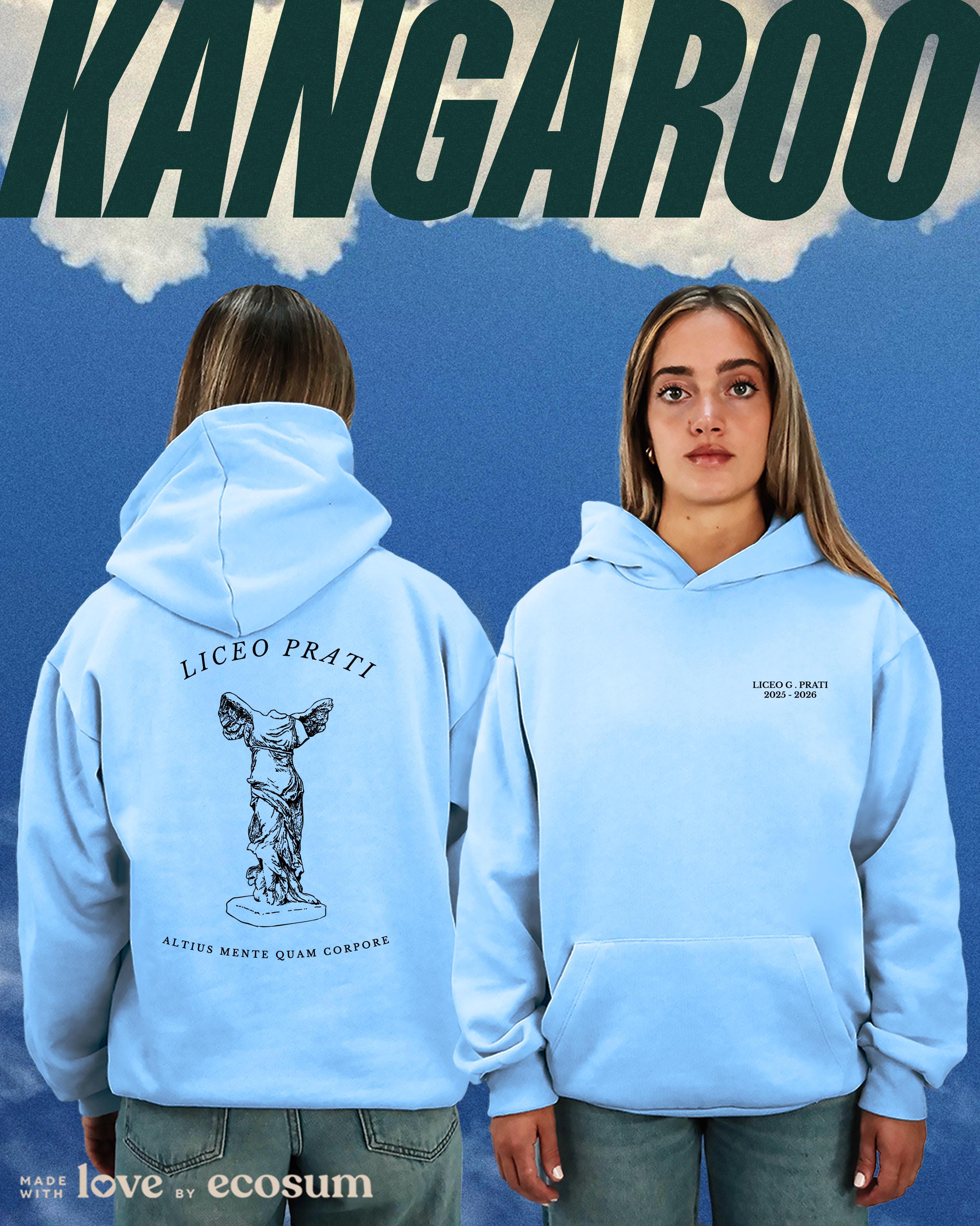 Hoodie iconica con cappuccio e tascone, studiata e prodotta in Italia con filati riciclati.