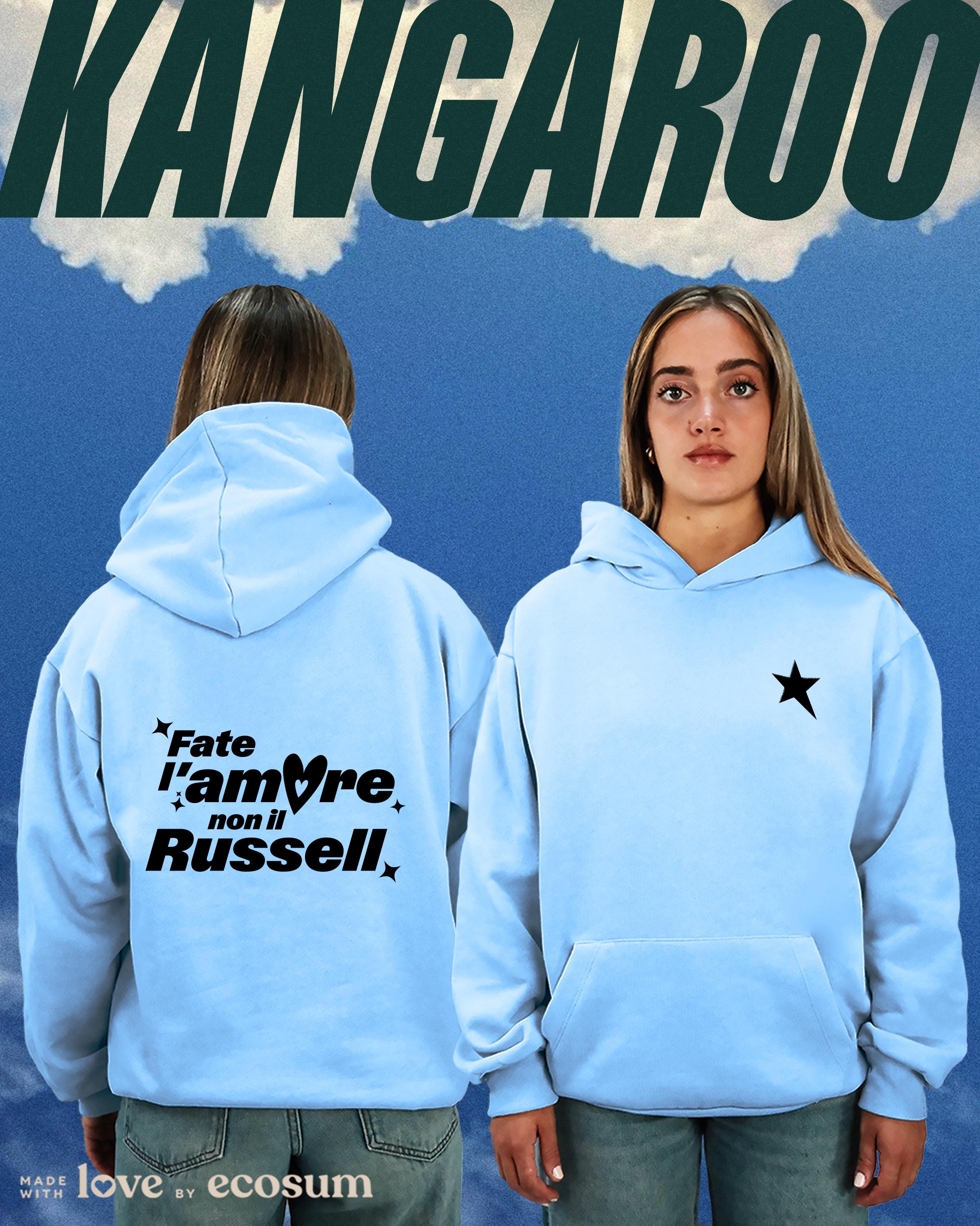 Hoodie iconica con cappuccio e tascone, studiata e prodotta in Italia con filati riciclati.