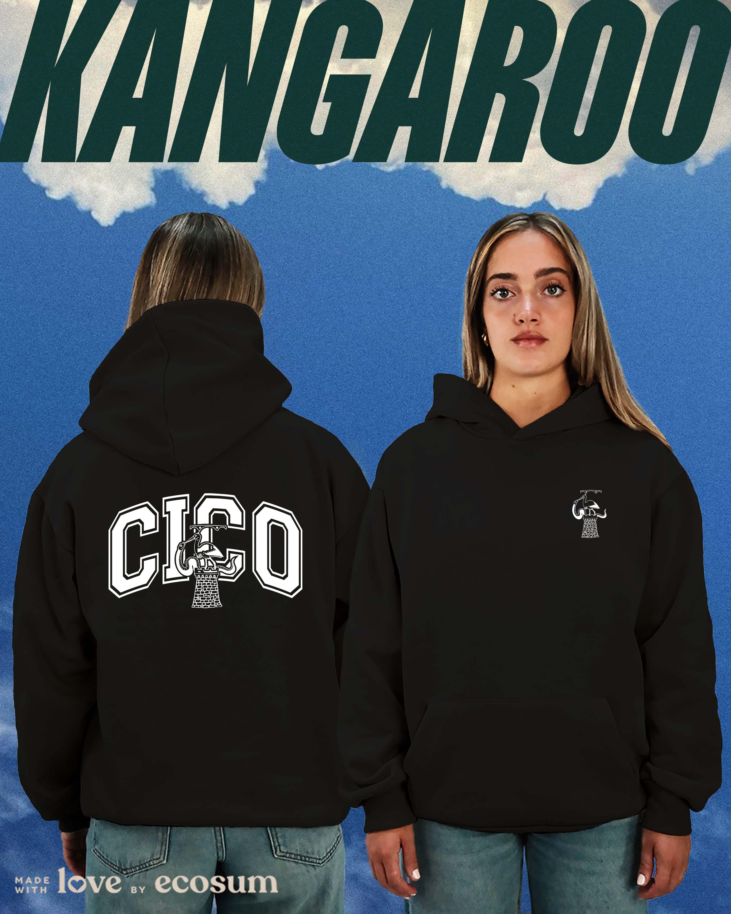 Hoodie iconica con cappuccio e tascone, studiata e prodotta in Italia con filati riciclati.