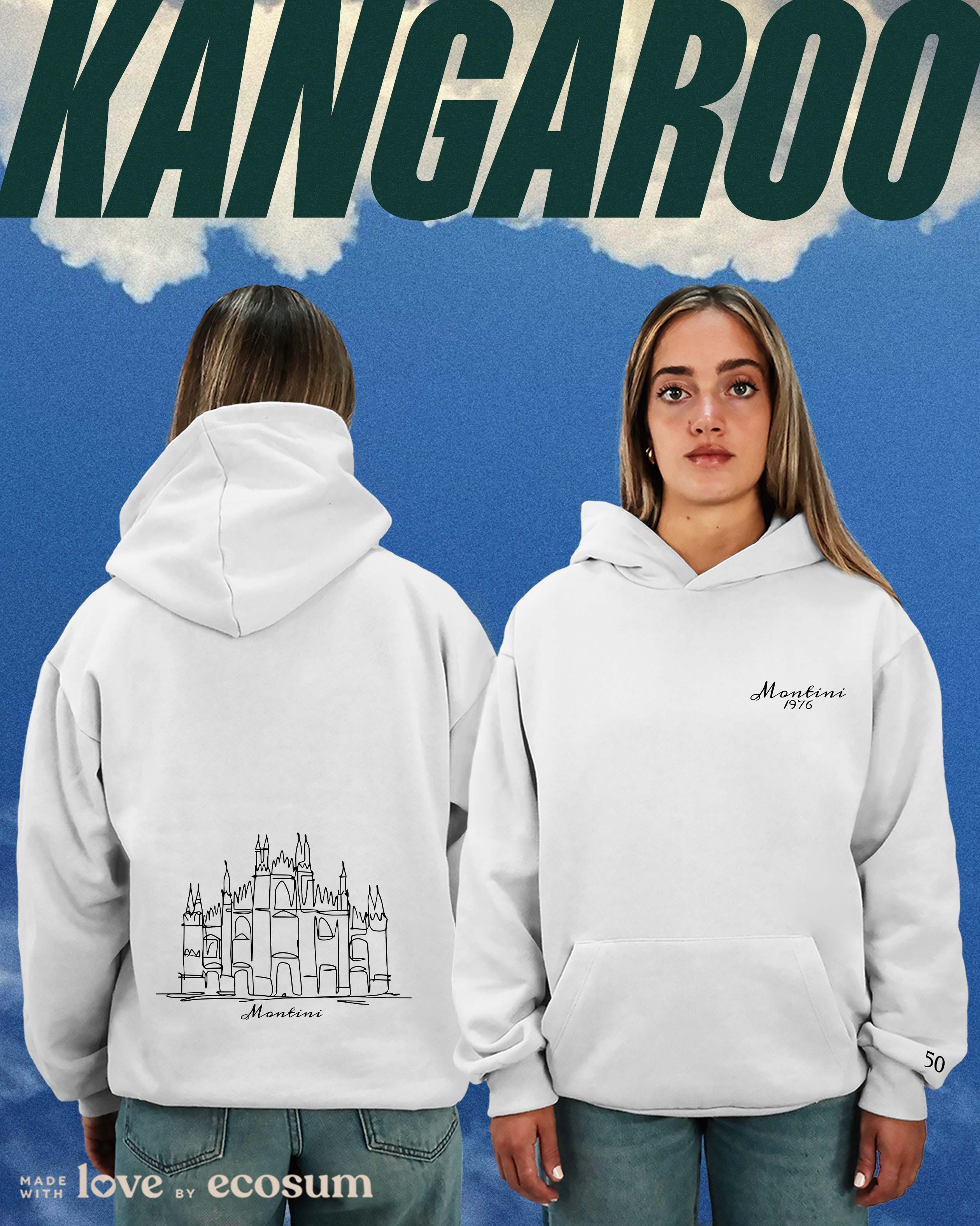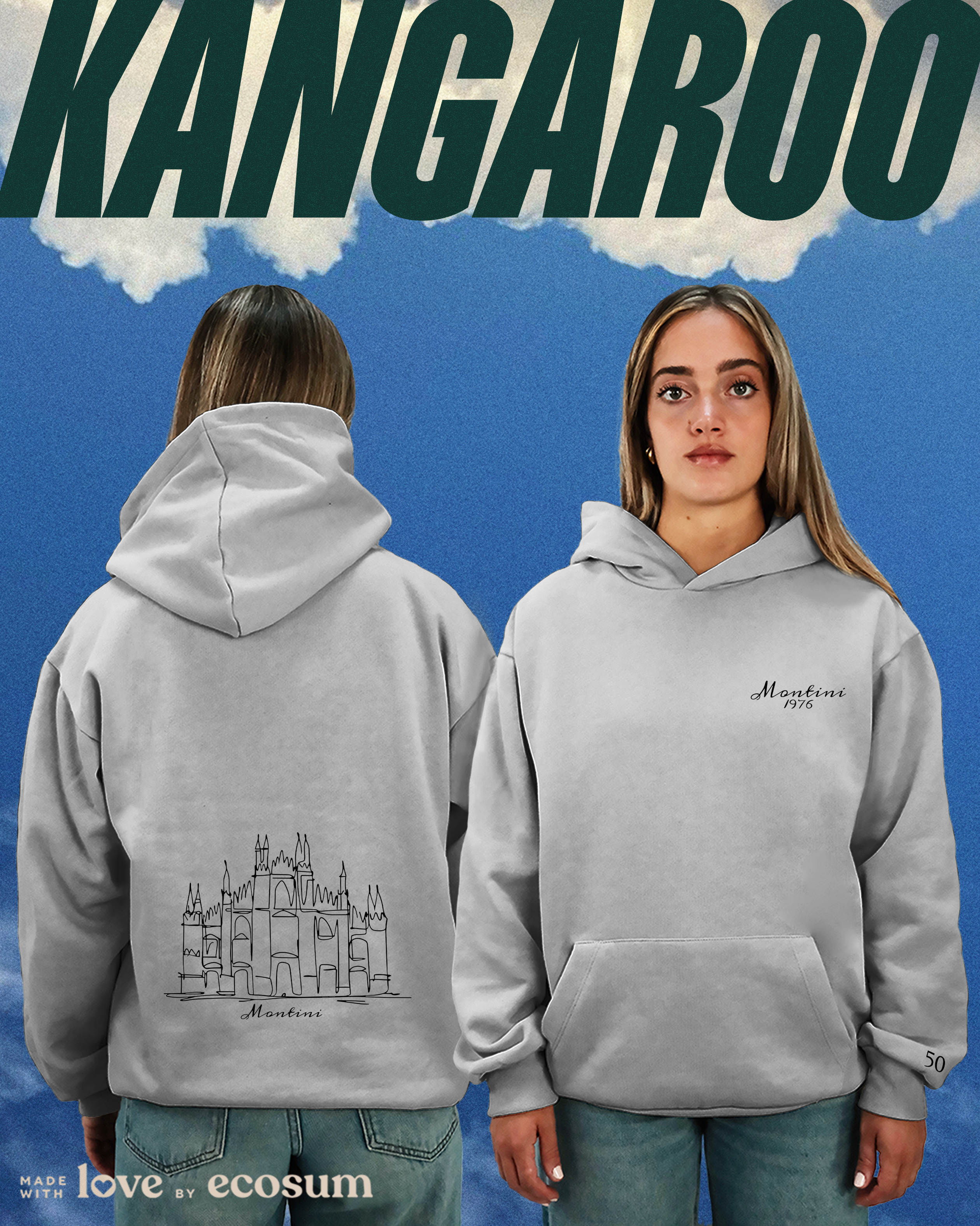 Hoodie iconica con cappuccio e tascone, studiata e prodotta in Italia con filati riciclati.