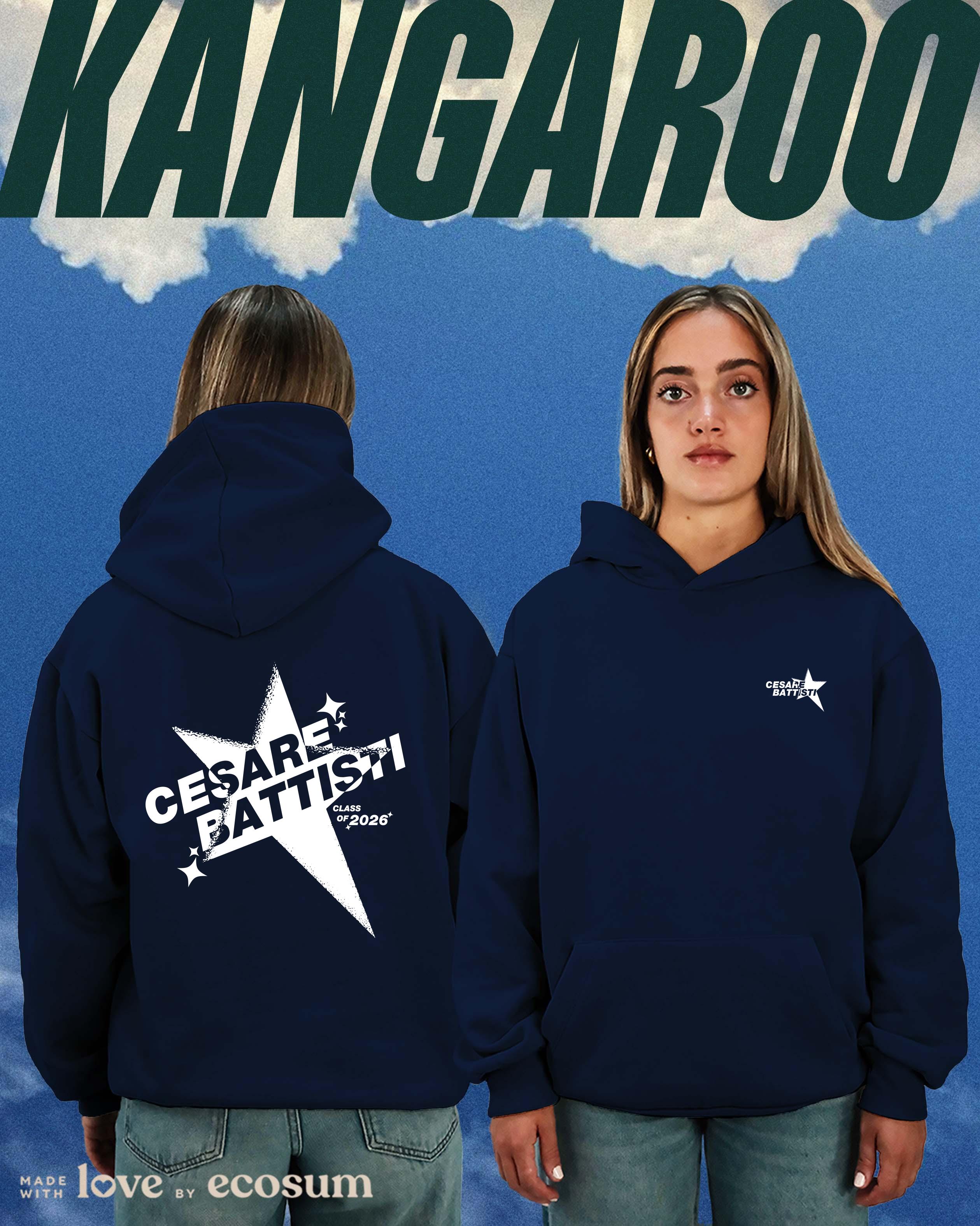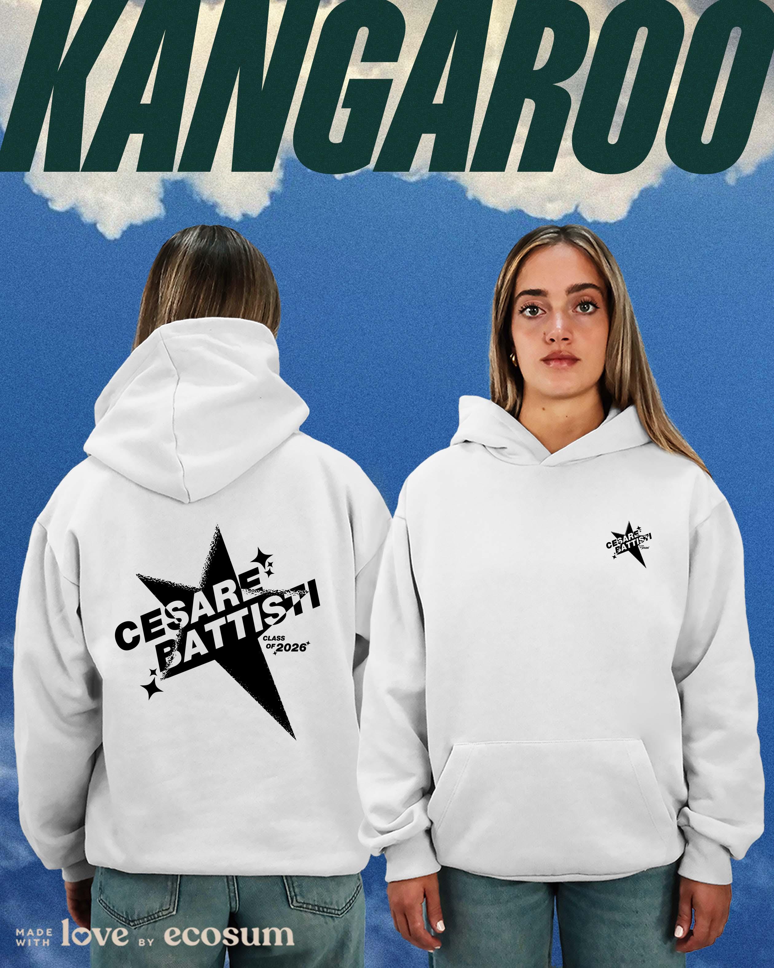 Hoodie iconica con cappuccio e tascone, studiata e prodotta in Italia con filati riciclati.